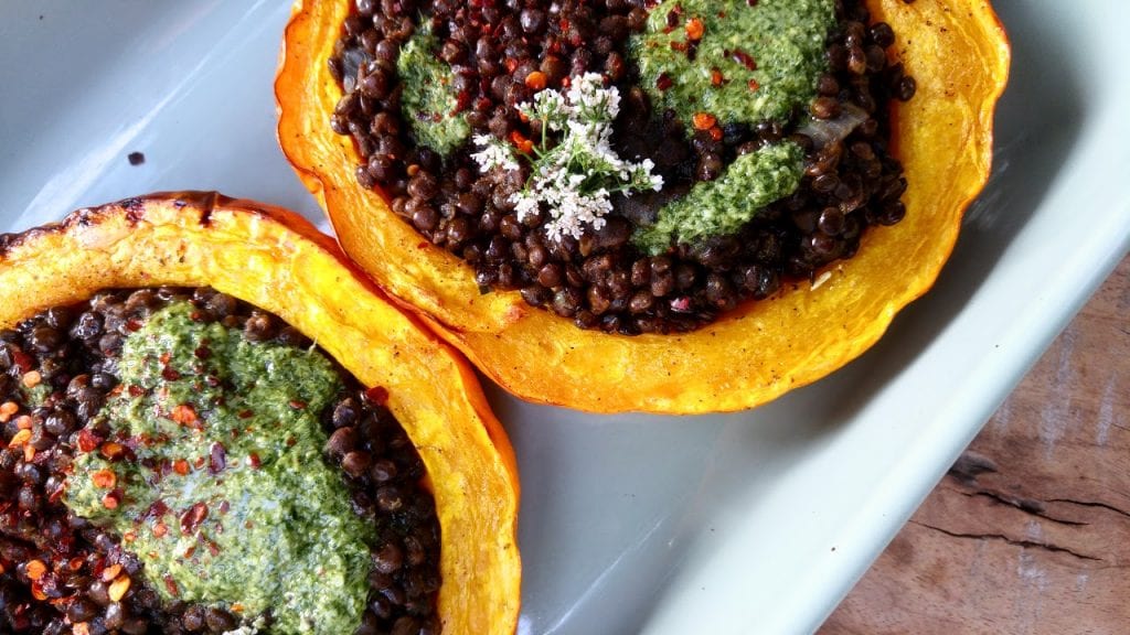 דלעת יפנית צלויה ממולאת דאל עדשים שחורות עם צ׳אטני נענע כוסברה מרענן