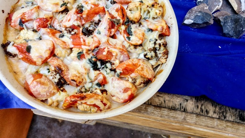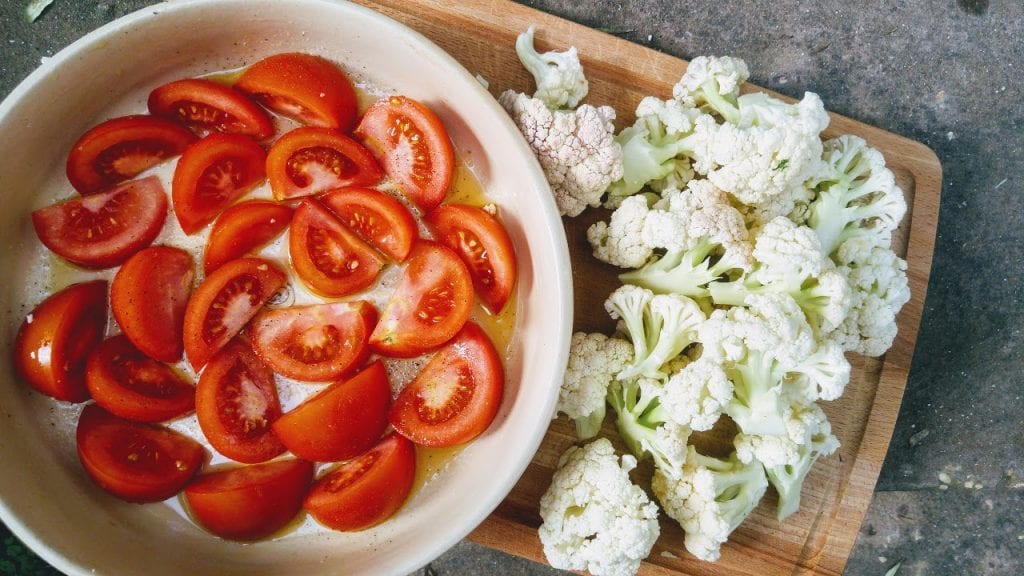 4. משמנים תבנית בשמן זית. מסדרים את פרוסות העגבניה ומתבלים במלח ופלפל. מסדרים את פרחי הכרובית, מזלפים שמן זית בנדיבות ומתבלים במלח ופלפל לפי הטעם. אופים בתנור עד שהכרוביות מזהיבות או משחימות.