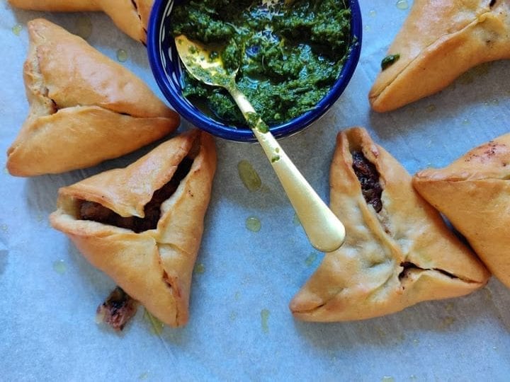 - מקפלים לצורת משולש ומהדקים את הקצוות כך שהם לא ייפתחו באפיה.